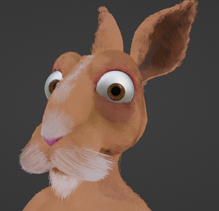 Sometime around 2019 I was very into Rango and wanted to make my own character inspired by the movie. While I'm aware of Doc Kenny, the jack rabbit doctor of the town of Dirt, I went with a design thats a bit more in line with a jackrabbit. Compared to your typical bunny they're much leaner in appearance so I attempted to reflect that by sculpting the body in the form of an old man. Of course I didn't realize to merge the old man anatomy with that of a digitigrade to better emphasize anthropomorphism, instead I assumed slapping on different styles of rabbit feet would suffice. After I had my base mesh though I decided this would be my first attempt at using hair particles and went right to work on grooming the character. This was well before the new hair system introduced in Blender 4.0, but I managed to make it work with the tools of the time. In total there's likely three hair groups on this model; the short hair that covers the surface of the head, the longer facial hair on the snout, and the longer tufts in the ears.